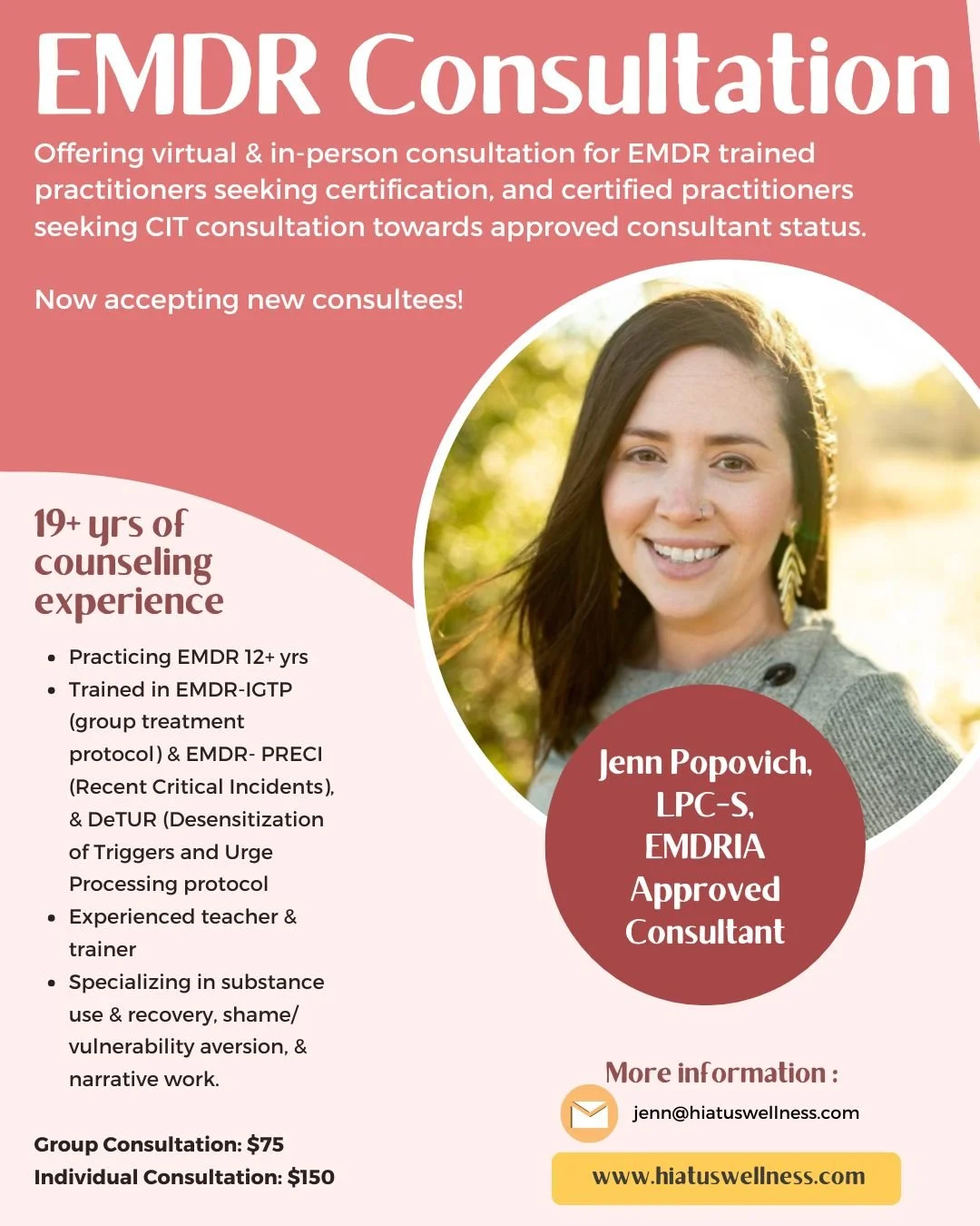 Consultation can be offered in person in San Marcos, TX or virtually to clinicians anywhere in the U.S. (EMDR Consultation cannot be used to count towards any other supervision or training requirements.) Jenn can provide hours towards certification and/ or consultation of consultation for CIT (consultants in training).